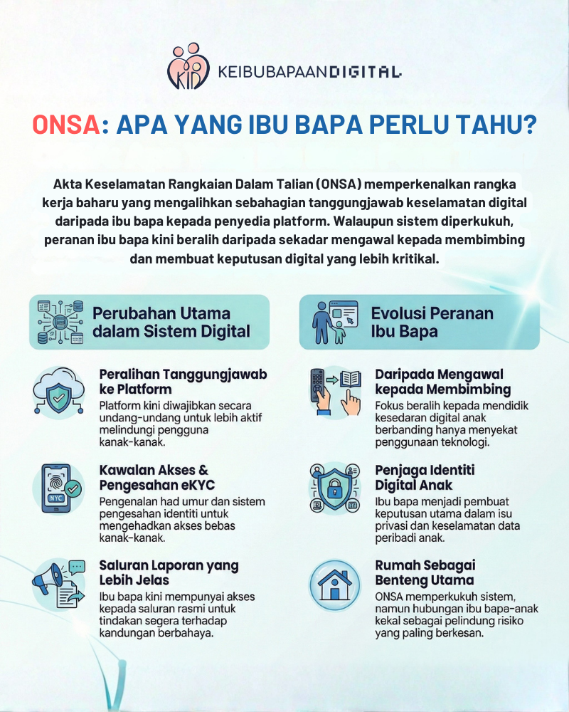Apabila kerajaan memperkenalkan Online Network Safety Act (ONSA), ramai ibu bapa mungkin tertanya-tanya—apakah kesan ONSA kepada kita sebagai ibu bapa? Adakah ini bermakna anak-anak kita akan lebih selamat? Atau adakah ini akan menambah lagi cabaran dalam mendidik anak dalam dunia digital?