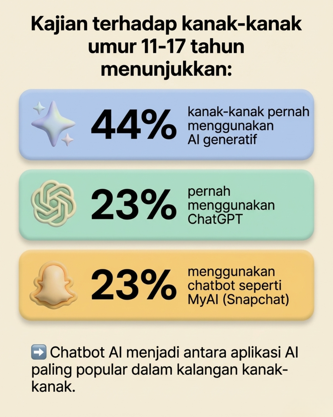 Menurut laporan Common Sense Media (2024), penggunaan AI generatif dalam kalangan remaja semakin meningkat dengan pantas. Ramai remaja menggunakan teknologi ini untuk membantu kerja sekolah, mencari maklumat, atau menjana idea untuk tugasan mereka.