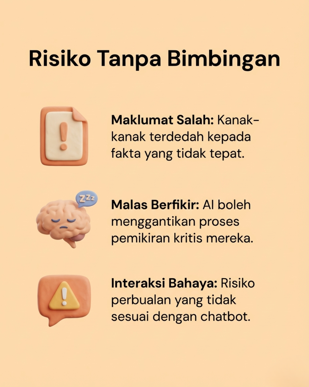 Walau bagaimanapun, penggunaan AI oleh kanak-kanak juga menimbulkan beberapa persoalan penting. Kanak-kanak mungkin menerima maklumat yang tidak tepat, terlalu bergantung kepada AI untuk mendapatkan jawapan, atau menggunakan teknologi tersebut tanpa memahami cara ia berfungsi.